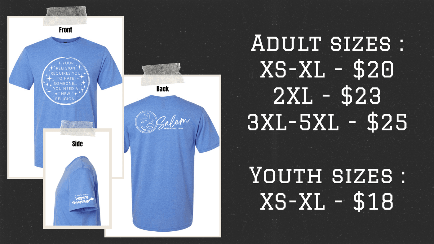 Encouraged by a Facebook post with the saying "if your religion requires you to hate someone... you need a new religion" and by Pastor Matt's sermon series "Worth Sharing"; Kathy M. and Shelley T. came up with another way to share Salem UMC and who we are... t-shirts! Together they came up with the idea and brought it to Pastor Matt, who blessed the concept straight away. Our Salem family has been emboldened to wear these shirts loud and proud in the community and they've certainly been noticed!